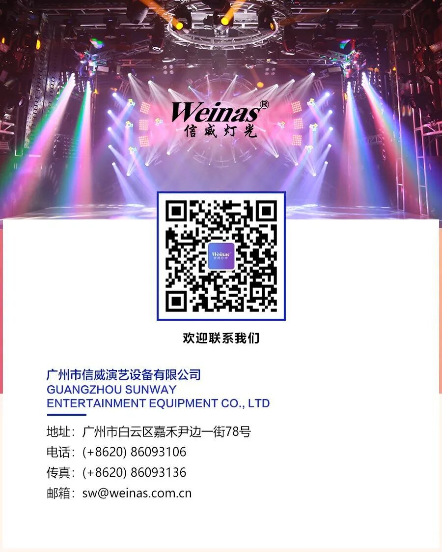 廣州市信威演藝設備有限公司成立于2007年(前身為廣州市聲威演藝設備廠,成立于1996年)是一家從事舞臺燈光設計、制造、銷售的專業制造商。信威燈光以舞臺照明為核心技術,為音樂會、多功能演播室、演藝項目、酒吧劇院等特殊照明領域提供專業的舞臺設備,還包括承接各類工程的設計,施工,調試和售后維修。 信威燈光專注外貿13年,公司90%的業務以出口為主,產品遠銷歐洲、北美、南美、東南亞、亞洲等100多個國家,成功打造了海內外知名的“Weinas”品牌。公司擁有豐富的產品資源,包括光束搖頭燈、追光燈、LED燈、激光燈、戶外防水燈、頻閃燈等舞臺設備。 我們堅信:質量是企業的生命,通過優化生產管理和質量控制系統,我們的大部分產品已獲得CE, RoHs, FCC認證,另外我司還成功通過ISO9001:2015質量管理體系認證和ISO14001:2015環境管理體系認證,這表明我們公司已經進入了一個標準化的、科學化的現代企業管理軌道,對公司的長遠發展具有重要意義。